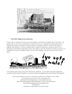 Això implica també que no acceptem les retallades, com diuen en Plaça Catalunya, “que es retallin els sous i els privilegis”. Des de l'avv l'òstia i la plataforma en defensa de la Barceloneta hem estat donant suport i participant en l'acampada de Plaça Catalunya. Cada dimecres està havent-hi una cassolada a la plaça del mercat a les 20 per exigir que es compleixin les demandes de mínims que s'han redactat a la plaça i amb les quals estem molt d'acord. Són molt llargues i no les podem posar aquí, però les podeu llegir en http://acampadabcn.wordpress.com/demandes/ o passar per Pescadors 49, on tenim una còpia. Es demana l'abolició dels privilegis per a polítics i banquers, grans responsables d'una crisi que estem pagant els més afectats per ella.
